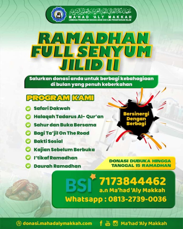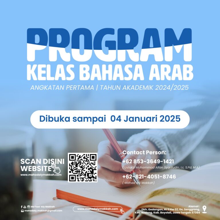 Bismillâhirrahmânirrrahîim.Dengan mengharap ridho dan taufiq-Nya, Ma’had Aly Makkah Boyolali kini menghadirkan program baru, program kelas belajar Bahasa Arab diakhir pekan. Program yang Cocok untuk yang ingin belajar Bahasa arab seperti Imam Masjid, Karyawan, Guru, dan Orang yang sibuk bekerja . Kitab yang akan dipelajari: Durus Al-Lughah Al-Arabiyah, Syaikh Dr. Abdurrahim, Universitas Islam al-Madinah Saudi Arabia […]